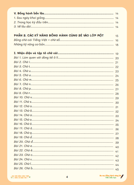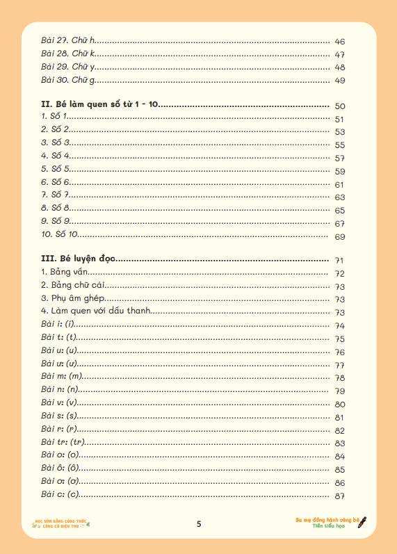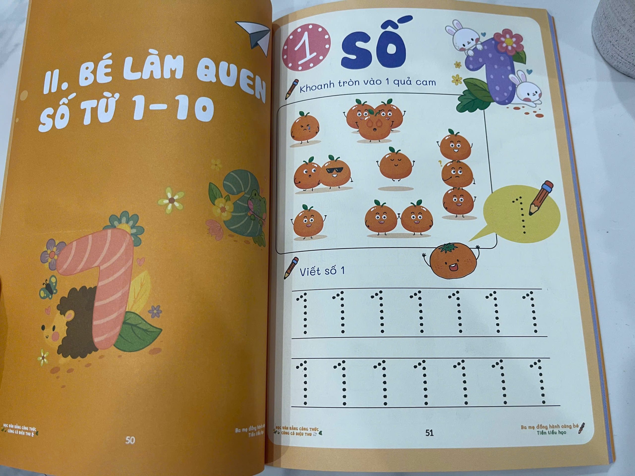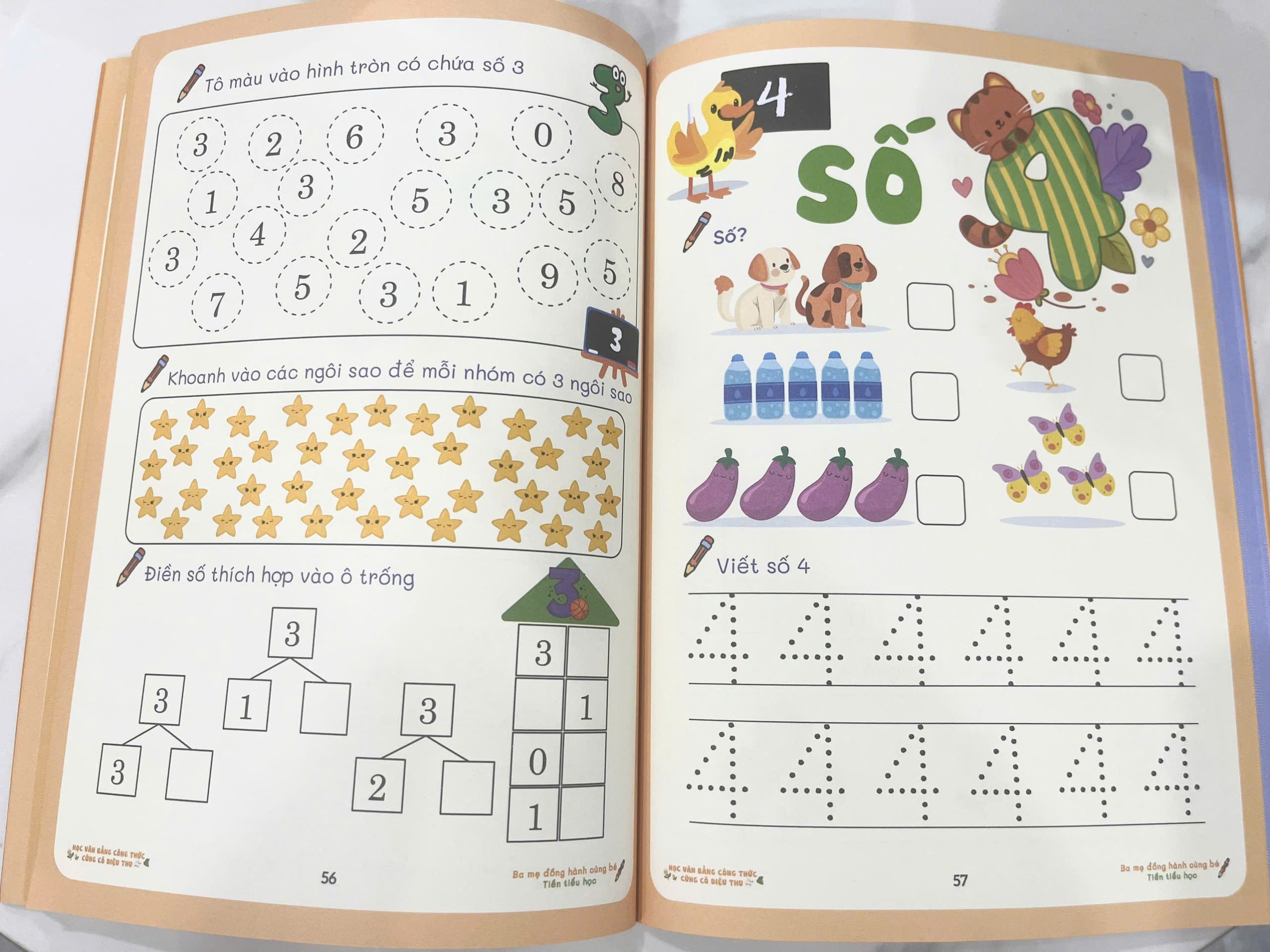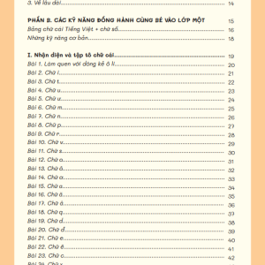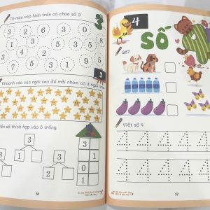 - Phần Thực hành kỹ năng: Bài tập làm quen chữ, số, tư duy, thói quen học tập.