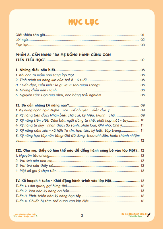 Cuốn sách “Ba Mẹ Đồng Hành Cùng Bé Tiền Tiểu Học” là bộ cẩm nang hỗ trợ phụ huynh chuẩn bị cho con giai đoạn chuyển tiếp quan trọng từ mầm non lên lớp Một. Sách cung cấp kiến thức tâm lý – phát triển – kỹ năng học tập phù hợp lứa tuổi, kèm theo hướng dẫn thực hành cụ thể giúp trẻ tự tin, sẵn sàng và hòa nhập tốt với môi trường tiểu học.